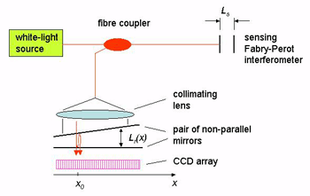 例如,干涉儀由兩個非平行的鏡子組成,以透射方式工作??梢钥闯?,氣隙Lr(x)取決于沿鏡子的位置x,并且在位置x0處產(chǎn)生最大干涉信號,其中Lr(x0)與傳感干涉儀的間隙Ls精確匹配。該位置x0很容易由安裝在鏡子后面的CCD陣列確定。