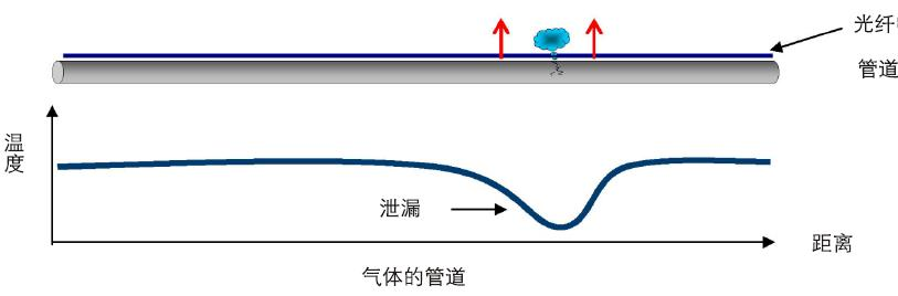 油氣管道泄漏時(shí)會(huì)引起泄漏點(diǎn)周圍溫度的變化,通過(guò)分布式光纖溫度傳感系統(tǒng)可以準(zhǔn)確定位泄漏點(diǎn)。在天然氣管線介質(zhì)泄漏受壓情況下,氣態(tài)物質(zhì)導(dǎo)致的泄漏點(diǎn)的低溫,是由物質(zhì)的物理性質(zhì)、工藝條件和周圍環(huán)境所決定的。這些點(diǎn)的溫度異常可通過(guò)分布式溫度測(cè)量而獲得,并有很好的溫度、距離和反應(yīng)時(shí)間精度。管道本身發(fā)生泄漏事故時(shí),泄漏出的天然氣由于存在壓力,會(huì)向管道周圍發(fā)出噴射狀的氣體。如果能對(duì)整條天然氣管道在現(xiàn)有的壓力、流量探測(cè)技術(shù)基礎(chǔ)上,利用沿管道敷設(shè)的通訊光纜,接入分布式光纖測(cè)溫傳感主機(jī),就能夠?qū)崟r(shí)探測(cè)到泄漏點(diǎn),并進(jìn)行泄漏點(diǎn)的定位和報(bào)警顯示。